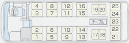 貸切バス:小型ハイデッカーセミサロン25 貸切バス部 貸切バスラインナップ お見積もり バスツアー よくある質問 営業所紹介 祐徳自動車貸切バス部の車輌ラインナップのご紹介 ミニタイプなのにワンランク上 定員:25名 小型ハイデッカーセミサロン25 後部座席はミニサロン。和気あいあいの小グループの旅行にぴったりの小型バス。※高速道路は中型料金です。 ■全長/7m ■正席/25(後部座席回転) バスの特徴 ・定員25人! 団体様でも1台でOKです。・貸切なので移動中は自由。お酒や会話を楽しんだり、ゆったりできます。・大きな窓からの眺めが抜群で、乗り心地も快適です。・設備充実! カラオケ、テレビ、DVDでバスの旅を満喫できます。・後部座席はミニサロン設定もできます。(非対応車種もあります)・色々なニーズにお応えできる小型車で、このゆとりを実現しました。 ※高速道路は中型車料金です。 充実機能 ※一部のバスには装備していない場合があります。 座席表 ※車内レイアウト例 座席表 ダウンロード( pdfファイル )