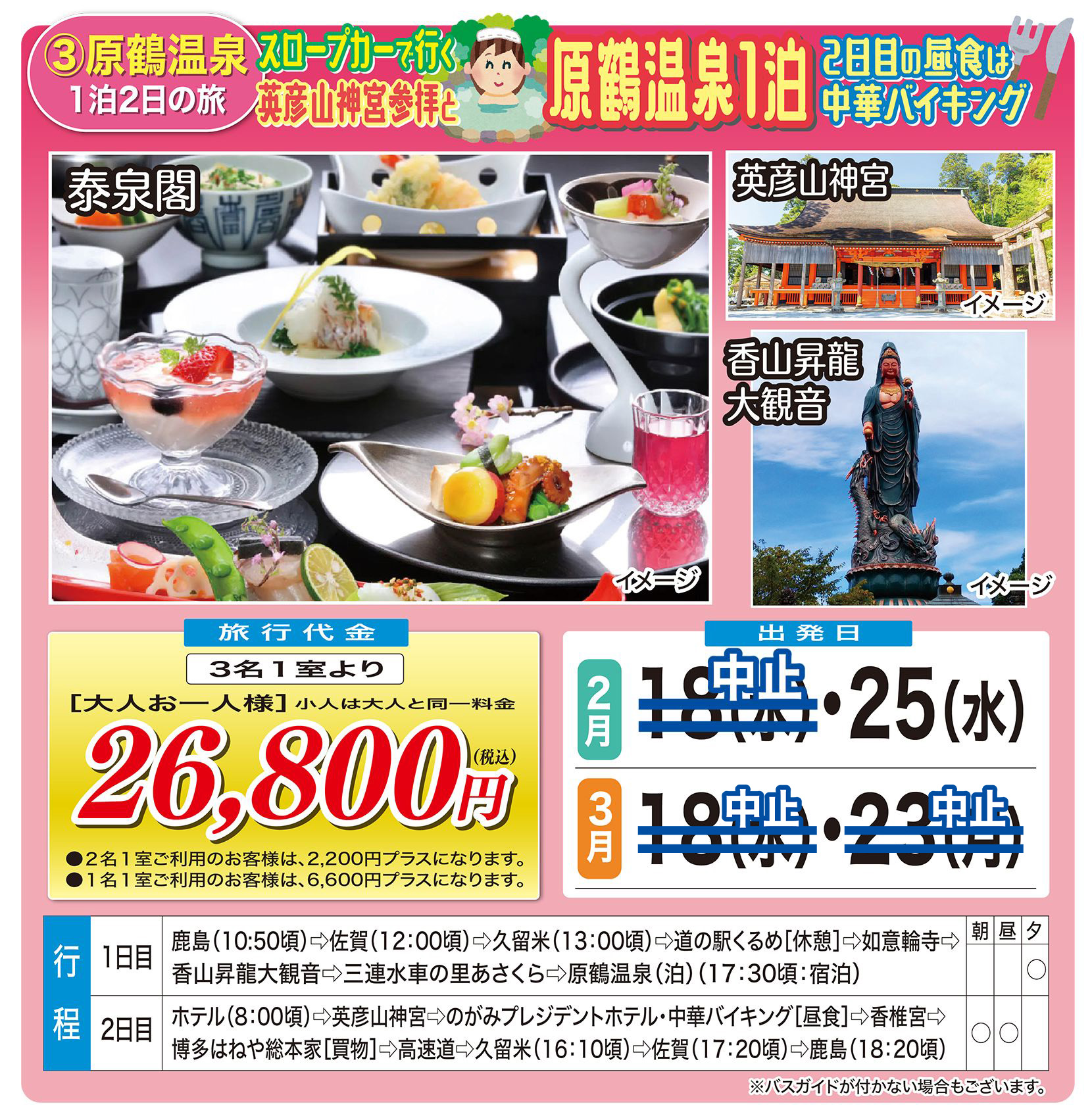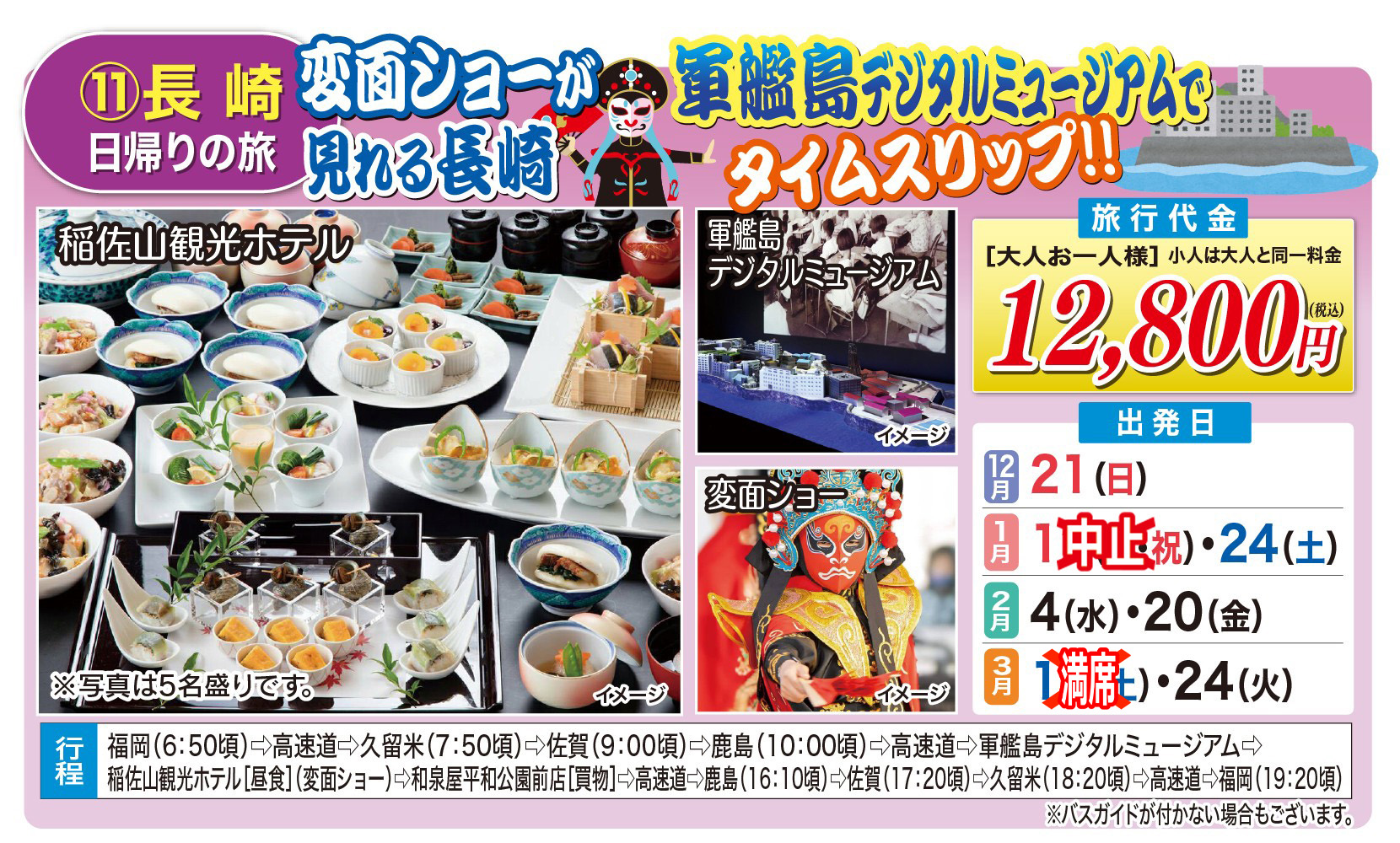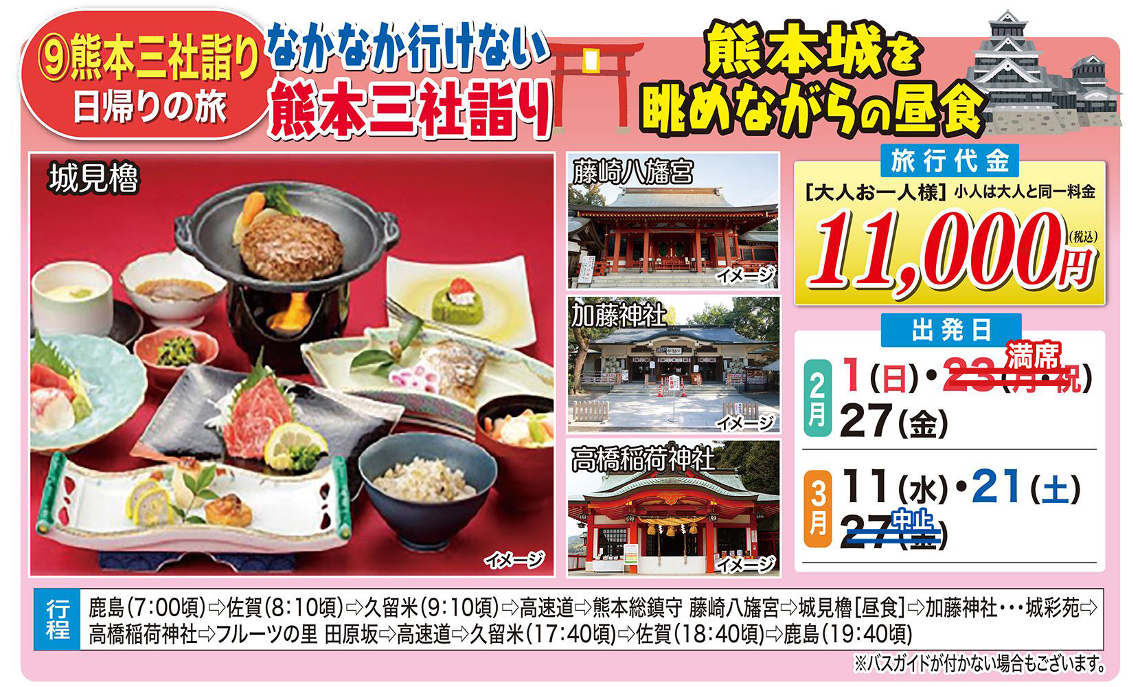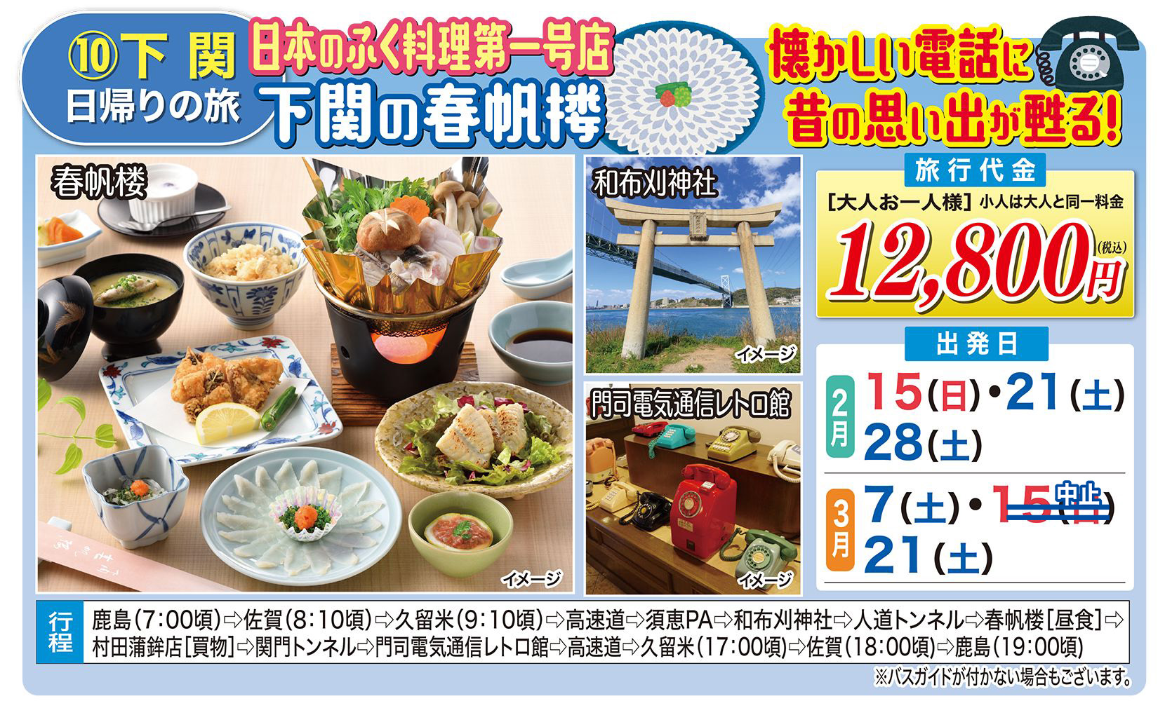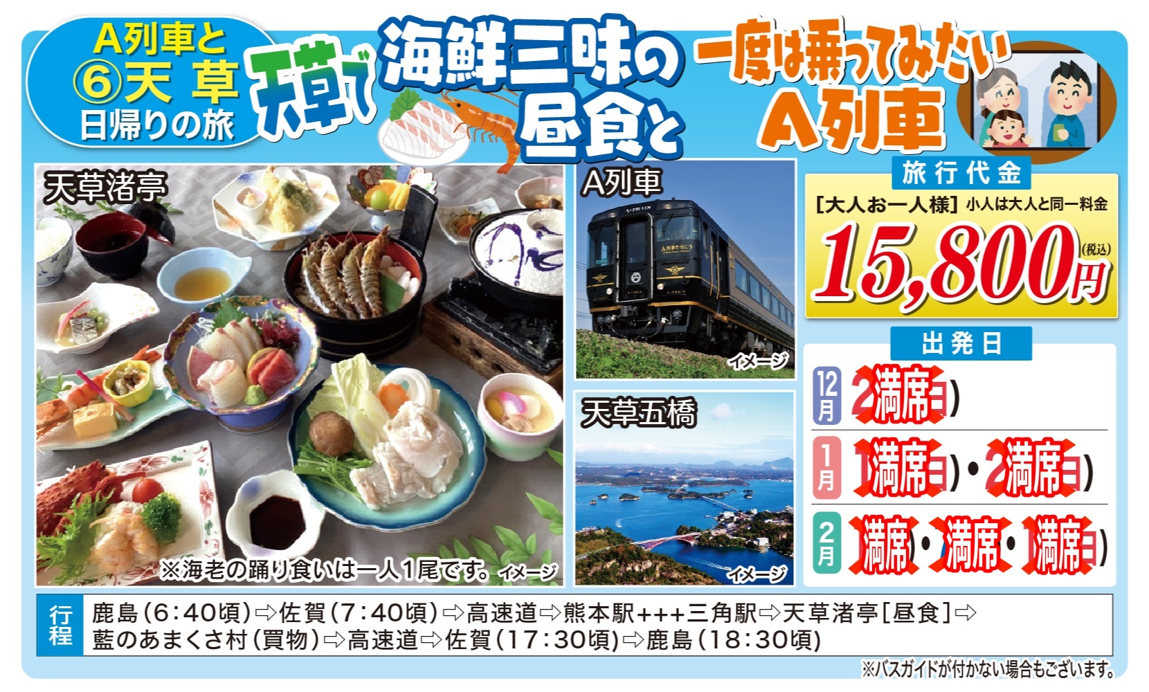 ■最少催行人員15名 左記人員に満たない場合旅行開始日の前日から起算してさかのぼって14日目に当る日より前(日帰りの場合は旅行開始日の4日前まで)に旅行を中止する旨を旅行者に通知します。詳しい旅行取引条件は係員が御説明します。