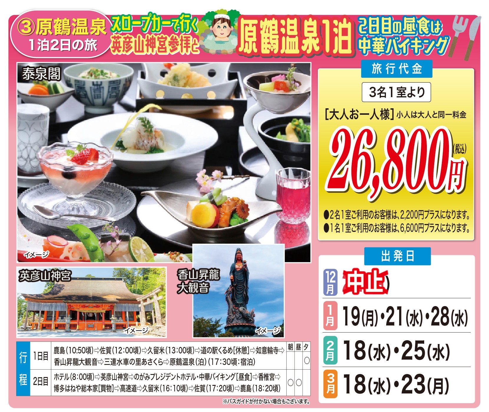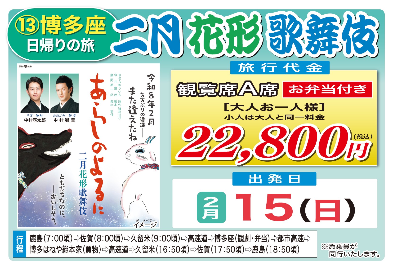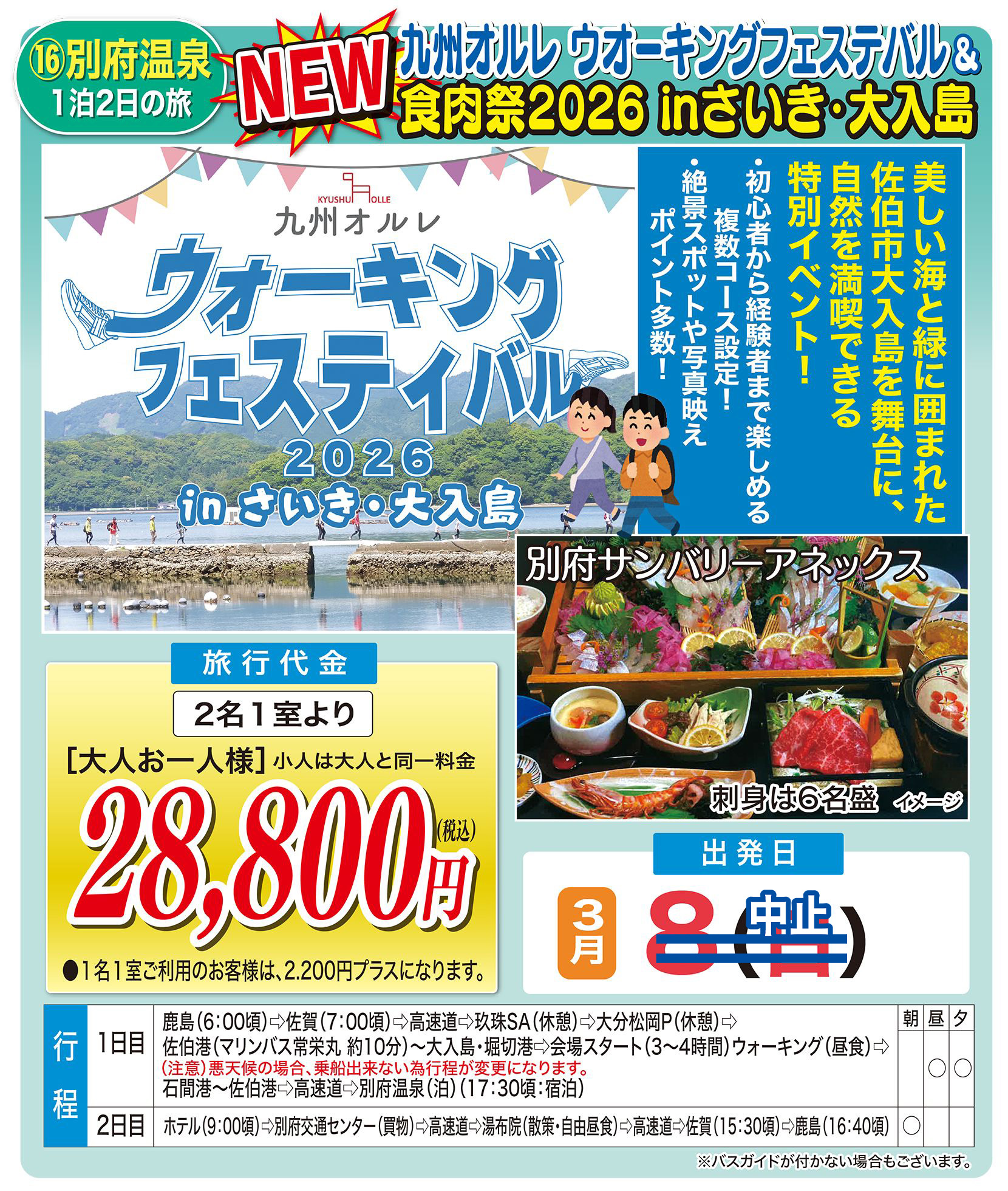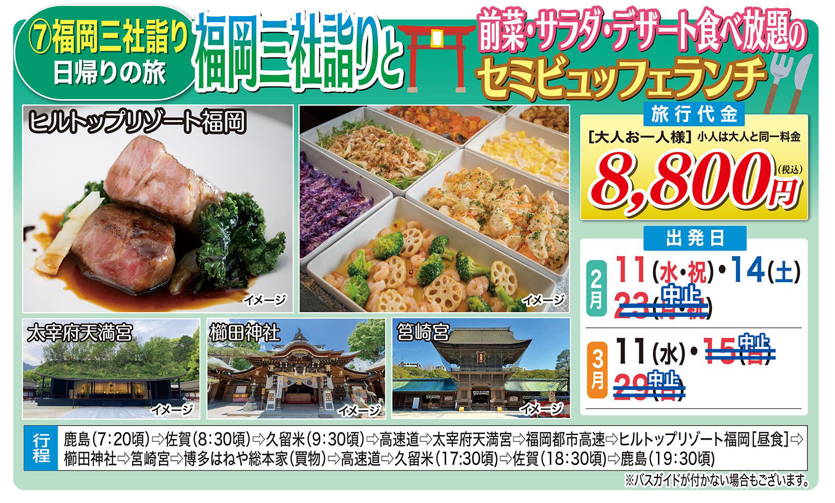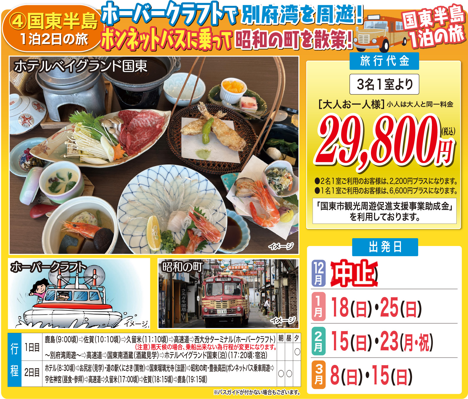 ■最少催行人員15名 左記人員に満たない場合旅行開始日の前日から起算してさかのぼって14日目に当る日より前(日帰りの場合は旅行開始日の4日前まで)に旅行を中止する旨を旅行者に通知します。詳しい旅行取引条件は係員が御説明します。