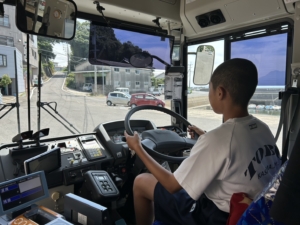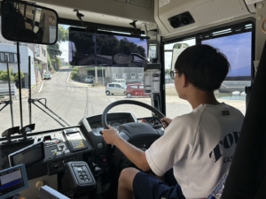 体験では、定期乗合バスの乗車体験、整備工場の見学、車内ポスター差替え作業等を行いました。