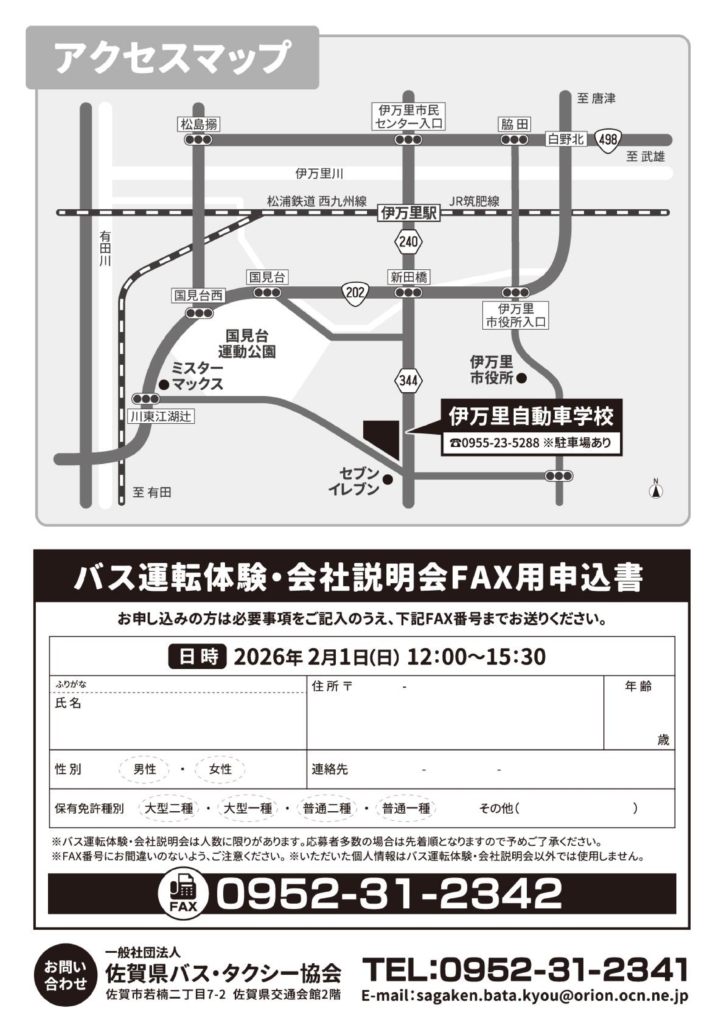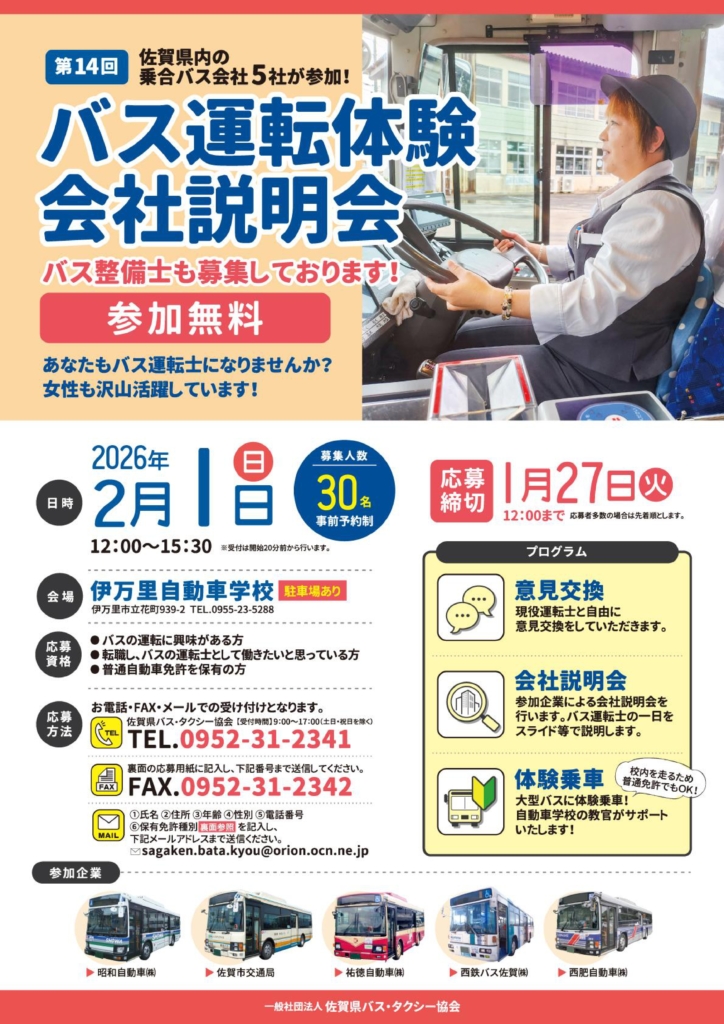 令和8年2月1日(日)伊万里自動車学校において、佐賀県バス・タクシー協会と県内の路線バス事業者5社の共催で